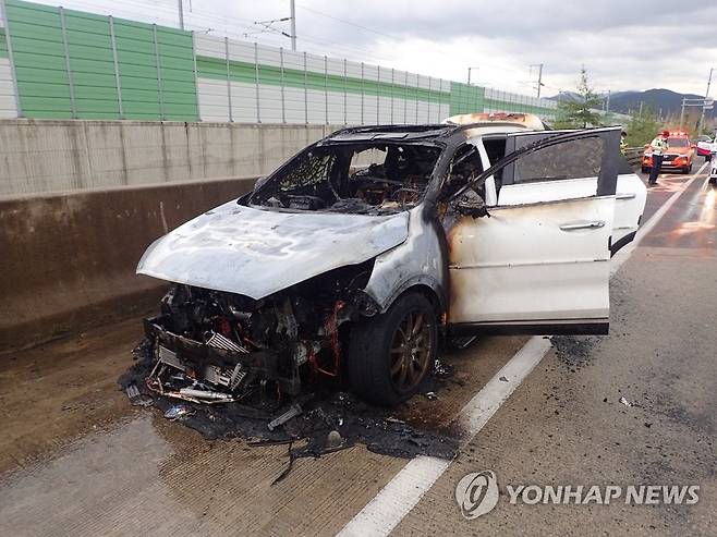(부산=연합뉴스) 18일 오전 11시께 부산 강서구 남해고속도로에서 달리던 차량에 불이 났다. 경찰과 소방당국은 정확한 화재 원인을 조사하고 있다. 2021.8.18