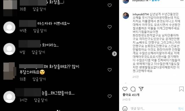 김인혁은 18일 인스타그램에 자신이 그간 받은 화장과 관련한 댓글 일부를 공개했다.