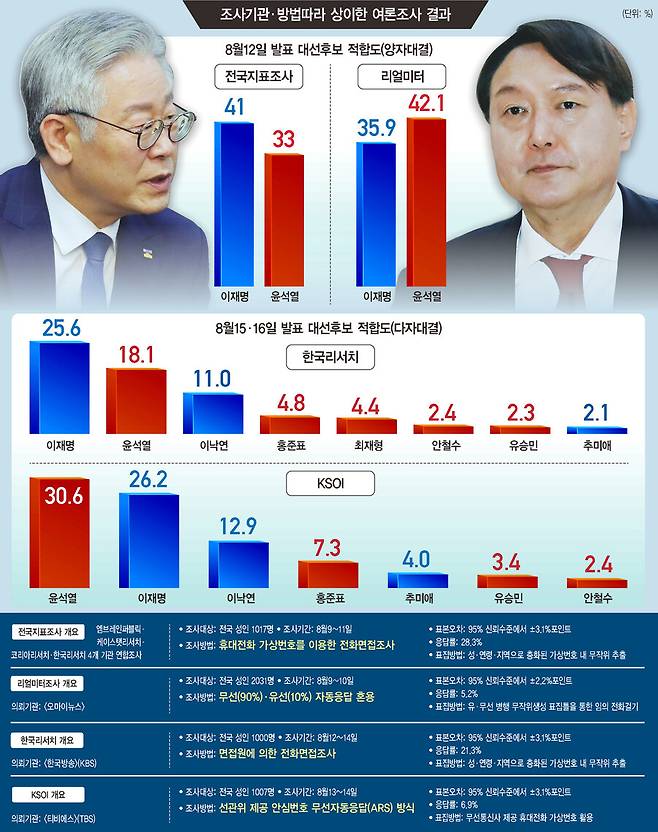 지난 12일 같은 날 발표된 서로 다른 여론조사기관의 조사 결과다. 1~2위 주자와 양자대결 모두 결과가 판이한데다 양자대결은 오차범위를 넘어서고도 우열이 엇갈린다. 전국지표조사(엠브레인퍼블릭·케이스탯리서치·코리아리서치·한국리서치)는 전화면접에 무선 100%로 조사한 반면, 리얼미터는 자동응답시스템(ARS) 방식에 유선 10%를 포함하는 등 조사 방법론에 차이가 있다. 그러나 조사 기간은 리얼미터가 지난 9~10일, 전국지표조사가 9~11일로 하루 차이뿐인데다 발표 날짜도 같다. 또 지난 15일 발표된 한국리서치의 여야 대선후보 적합도 조사에서 윤석열 전 검찰총장은 18.1%의 지지율로 오차범위를 벗어난 2위를 기록했지만, 다음날 발표된 한국사회여론연구소(KSOI) 조사에서는 30.6%로 1위였다.(자세한 내용은 중앙선거여론조사심의위원회 누리집 참고) 유권자들은 어떤 조사 결과를 믿어야 할까.