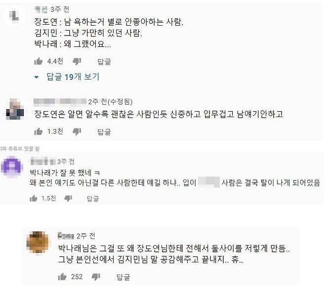 최근 유튜브와 온라인 커뮤니티 게시판에는 과거 김지민이 방송에서 밝힌 절친 장도연과 멀어지게 된 에피소드가 재조명돼 박나래의 언행을 문제시 삼는 여론이 형성되고 있다.