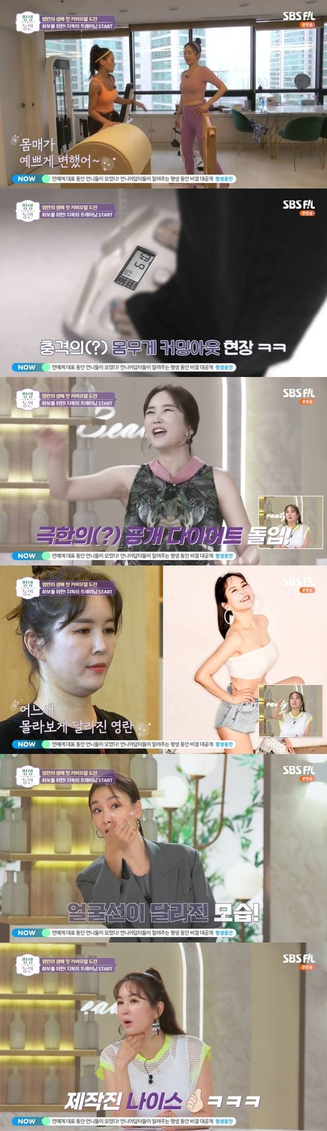 이어 장영란은 또 운동을 하러 갔고 장영란의 다이어트 이전 영상과 현재 모습이 비교됐다. 장영란은 “61kg 육박했을 때다”며 과거 영상을 꼬집었고, 지켜보던 이들이 “얼굴선이 달라졌다”, “얼굴이 작아졌다”고 입을 모아 감탄했다. 장영란도 “비교 잘했다”고 비교 영상을 만든 제작진을 칭찬하며 얼굴이 달라졌다고 인정했다. (사진=SBS FiL ‘평생동안-여자플러스4’ 캡처)