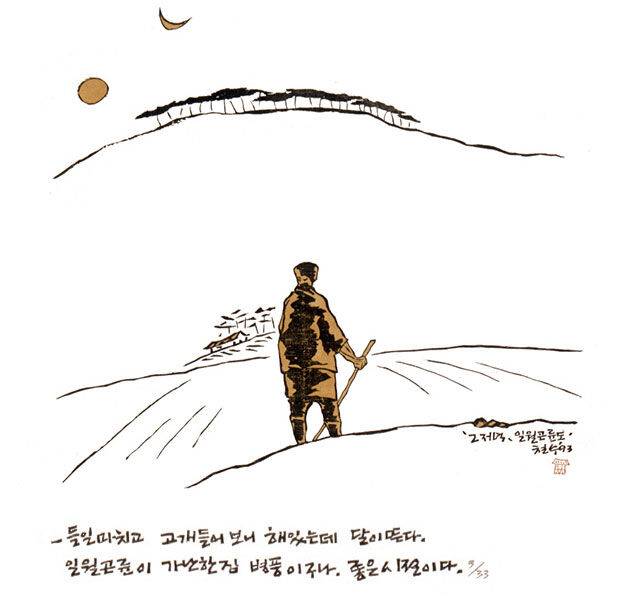 "단순하고 질박한 그의 판화가 곁들인 간결한 화제는