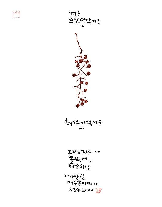 "머루나무가 뜰에 있는데 아버지가 단독주택에 사실 때 가지고 계시던 걸 옮겨 와서 계속 가꾸고 있어요. 어느 해 송이가 부실해 그걸 이렇게 보면서 나도 모르게 '겨우 요거 달렸네'라고 생각하면서 머루를 따려고 가까이 갔는데 갑자기 머루가 나에게 이야기하는 것 같은 기분이 들었어요. '최선이었어요'라고 하는 소리를요. 아무도 쳐다보는 사람 없는데 머루나무, 머루 송이 앞에 서서 스스로 막 부끄러워서 어쩔 줄 모르겠더라고요. 그날 그림을 그렸어요. '겨우 요것 달았어?' 그랬는데 '최선이었어요' 라고 머루가 대답하고 '몰랐어, 미안해' 이렇게 이제 제가 사과하는 그림을 그렸죠.
