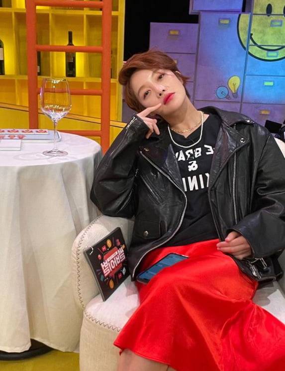 또 다른 사진에서 황보라는 빨간색 스커트에 가죽 재킷을 착용하고 녹화를 준비중이다. 앞서 공개한 사진과는 다른 시크한 매력을 드러내 눈길을 끌었다.