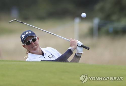 South Africa's Ashleigh Buhai plays out of a bunker on the 13th green during the second round of the Women's British Open golf championship, in Carnoustie, Scotland, Friday, Aug. 20, 2021. (AP Photo/Scott Heppell)