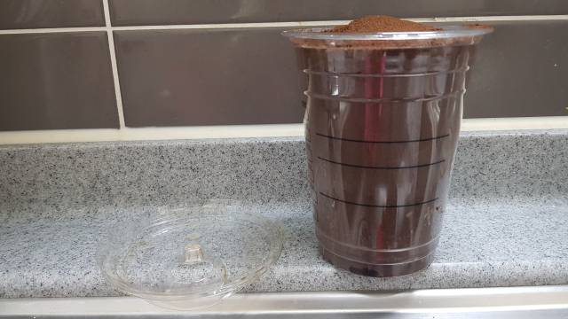 ▲먹고 남은 커피잔 : 커피찌꺼기 원재료를 담을 수 있는 저장고