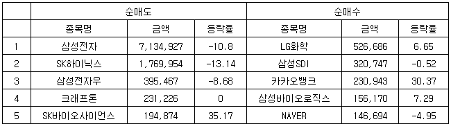 개인 순매수 1·2위는 삼성전자(7조2천917억원)와 SK하이닉스(1조8천894억원)로, 외국인 매도세에 급락한 이들 종목을 저가 매수 기회로 삼으며 반등을 기대하는 것으로 풀이된다.