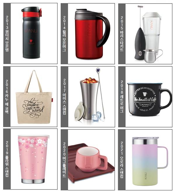 굿즈 하나를 내놓기까지는 마케팅, 디자인, 품질, 안전성, 트렌드 등을 단계마다 꼼꼼하게 살펴보고 고민하는 과정을 거친다. 일단 커피와 연관된 제품이어야 한다는 게 카누 굿즈의 기준이 된다. 머그, 텀블러, 보온병이 굿즈에서 가장 큰 비중을 차지하는 이유다.