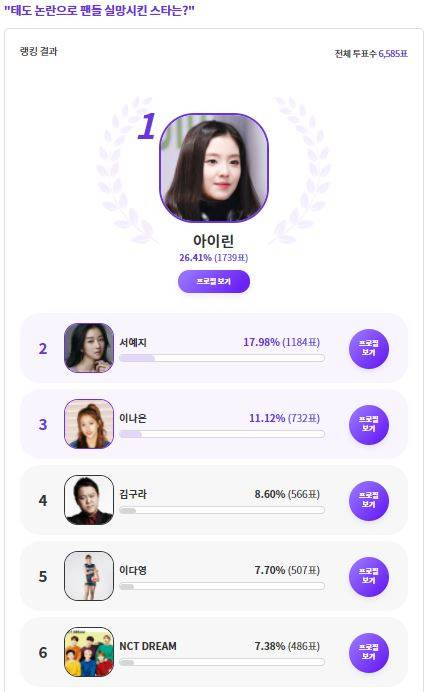 커뮤니티 포털사이트 디시인사이드(대표 김유식)와 취향 검색 기업 마이셀럽스가 운영 중인 '익사이팅디시'가 '태도 논란으로 팬들 실망시킨 스타는?'으로 투표를 한 결과 아이린이 1위에 올랐다.