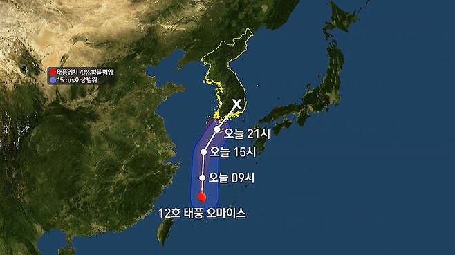 12호 태풍 '오마이스'가 한반도를 향해서 빠르게 북상해, 오늘(23일) 밤 자정쯤 남해안에 상륙할 것으로 예상됩니다. 소형 태풍이지만 거센 바람과 함께 남부지방에는 최대 400mm가 넘는 집중호우가 예상돼 피해가 우려됩니다.