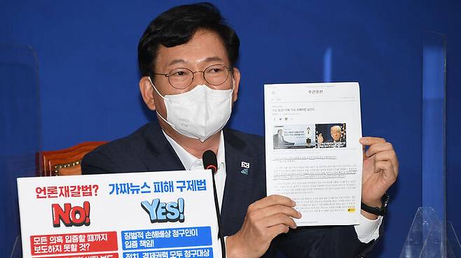 박용진 민주당 대선 경선 후보는 오늘(23일), 국회에서 공약 발표 회견을 가진 뒤, 기자들과 만난 자리에서 "법 취지엔 적극 공감한다."라면서도, "자칫 개혁의 부메랑 효과로 언론의 비판·견제 기능 부분에서 사회적 손실이 나타날 수 있다는 우려가 있다."라고 말했습니다.