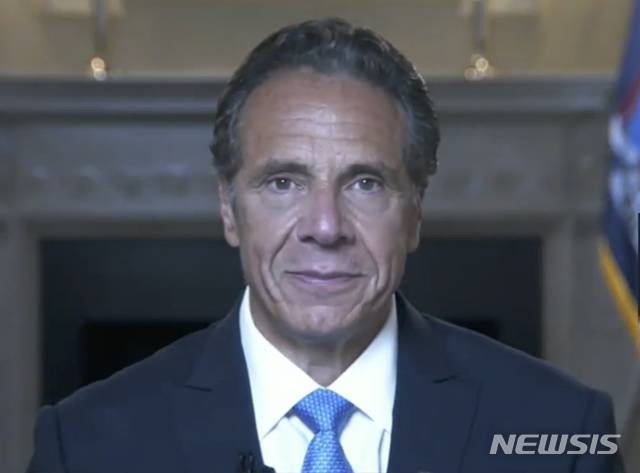 [뉴욕=AP/뉴시스] 앤드루 쿠오모 미국 뉴욕주지사가 23일(현지시간) 화상을 통해 고별 연설을 하고 있다. 쿠오모 주지사는 사전 녹화된 영상을 통해 성추행 의혹을 재차 부인하며 과도한 정치적 압력과 언론의 광란이 자신의 성추행 혐의에 오판을 낳았다고 주장했다. 쿠오모 주지사의 퇴임으로 캐시 호컬 부지사가 24일 자정을 기해 뉴욕주 최초의 여성 주지사가 된다. 2021.08.24.