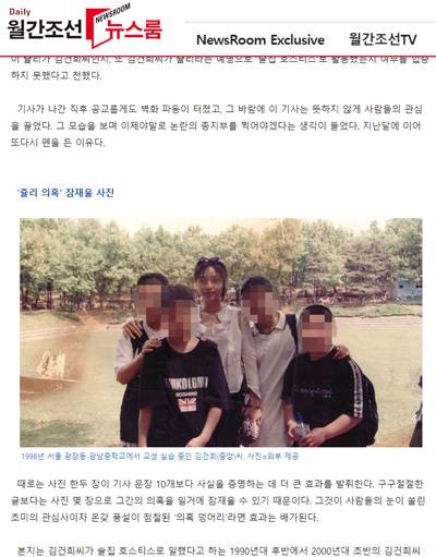 그런데 최근 <월간조선>이 "쥴리 의혹을 잠재울 사진"이라며 공개한 사진 중 김씨가 학생들과 찍은 것이 있는데, 사진설명은 이랬다.