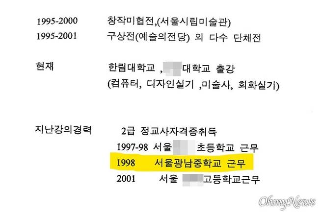 또 한 가지 이상한 점은 '지난강의경력' 부분이다. 김씨는 여기에 '1998년 서울광남중학교 근무'라고 적었다.