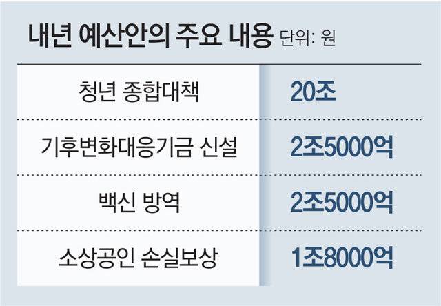 내년 예산에는 신종 코로나바이러스 감염증(코로나19) 관련 소상공인 손실 보상에 사용될 1조8000억 원이 반영된다. 저소득층 한부모 가정 양육비는 월 10만 원에서 20만 원으로 인상된다. 저소득층을 위한 연 10만 원의 교육 바우처도 신설된다.