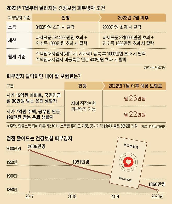 마지막 허들은 재산이다. 과세표준 3억6000만원 이하(3억6000만~9억원인 경우엔 연간 소득 1000만원 이하)여야 한다. 현재 과세표준 기준은 5억4000만원인데 대폭 낮아진다. 과세표준은 아파트의 경우 공시가격의 60%다. 시가 15억원(과세표준 약 5억4000만원)인 아파트 보유자가 국민연금으로 매달 90만원씩 받고 있다면 현재는 피부양자 자격을 유지할 수 있다. 하지만 내년 7월 조건이 강화되면 탈락이다. 지역 가입자가 되면 내야 할 보험료는 월 23만원이다.