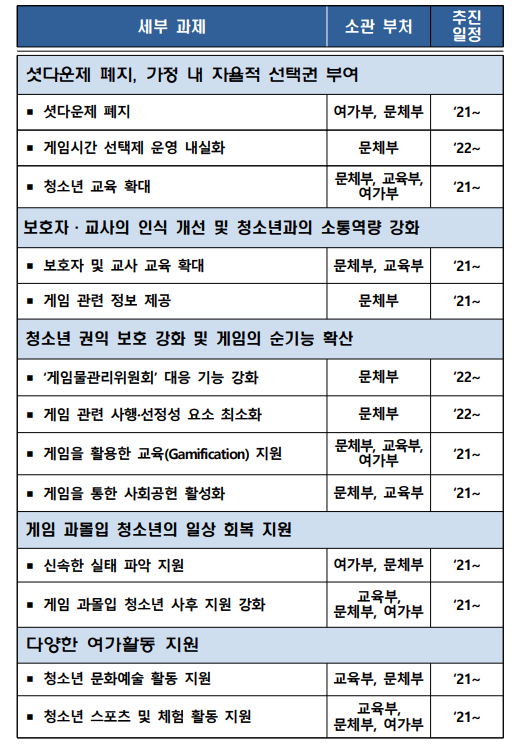 이번 방안은 청소년의 게임 이용환경 변화를 반영해 셧다운제를 폐지하고 자율적 방식의 ‘게임시간 선택제’로 청소년 게임시간 제한제도를 일원화하는 동시에 청소년과 보호자, 교사 등에게 게임이해 교육을 강화하는 내용을 담았다. 청소년의 자기결정권 및 가정 내 교육권을 존중하여 자율적 방식으로 청소년의 건강한 게임 여가문화가 정착되도록 지원하는 것이다.
