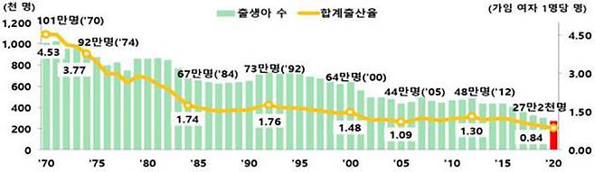 여성 한 명이 평생 낳을 것으로 예상되는 평균 출생아 수인 합계출산율은 통계 작성 이래 최저치인 0.84명으로 지난해보다 0.08명 감소했습니다.