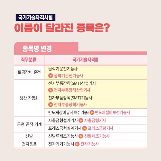 생산 자동화 | 전자부품장착(SMT)산업기사 → 전자부품장착산업기사 / 전자부품장착(SMT)기능사 → 전자부품장착기능사 / 반도체장비유지보수기능사 → 반도체설비보전기능사