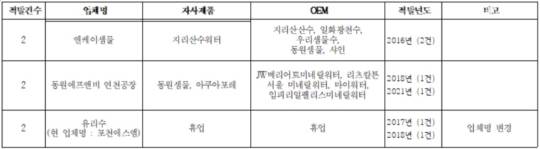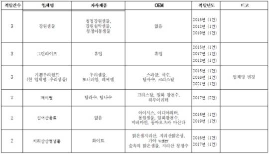 지금 언급된 곳 외에도 2015년부터 2021년까지 수질기준 미달로 2번 이상 행정처분을 받은 제조업체에 대해선 자사제품과 OEM으로 납품하는 상품까지 표로 정리해서 올려둘 예정입니다.