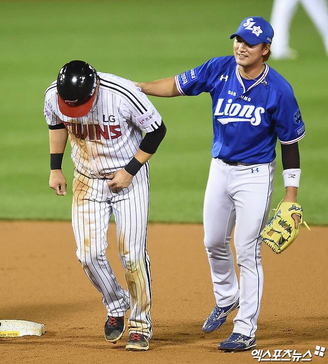 (엑스포츠뉴스 잠실, 박지영 기자) 27일 오후 서울 송파구 잠실야구장에서 열린 '2021 신한은행 SOL KBO리그' 삼성 라이온즈와 LG 트윈스의 경기, 6회말 1사 1루 LG 서건창 타석 때 1루주자 오지환이 2루 도루를 시도했으나 삼성 2루수 김상수에게 태그아웃 당하며 실패,, 김상수가 오지환을 격려하고 있다.