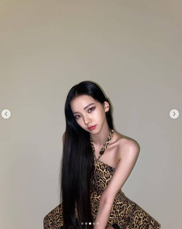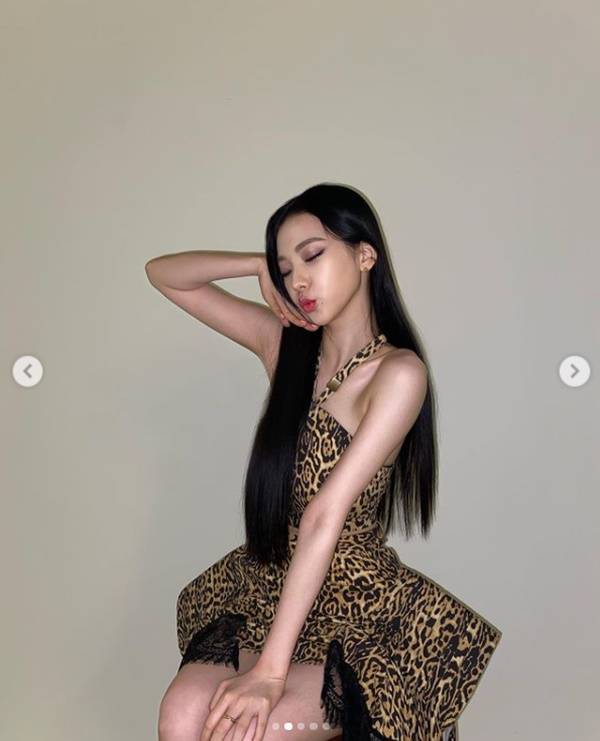 사진 속 카리나는 호피무늬 의상을 입고 섹시한 비주얼의 정점을 찍었다.