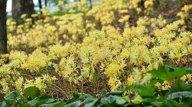 전남 장성군 장성공원에서 노란 상사화가 만개했다. 장성공원 기슭에서는 노란 상사화가 군락을 이루고 있다.