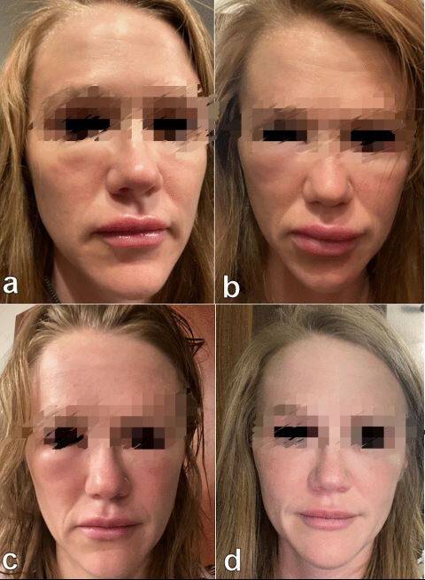 (미국 노스캐롤라이나의 웨이크포레스트대 연구팀이 지난 2월 낸 논문에 실린 모더나 접종 이후 부종 보고 사례다. 접종 36시간 뒤 부종(a)이 나타나기 시작해, 접종 48시간 뒤(b) 더 심해졌고, 60시간 뒤(c) 나아지기 시작해 72시간이 경과(d)하자 거의 가라앉은 것으로 추정된다)