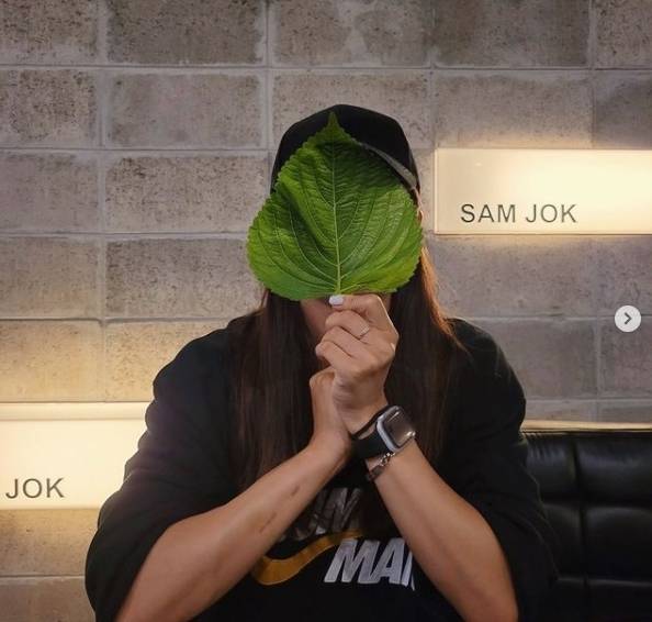 홍효진은 사진과 함께 "깻잎으로 얼굴 다 가려지냐고 물어봤는데 팔근육 지린다고 하네. 인정"이라고 덧붙여 웃음을 자아냈다.
