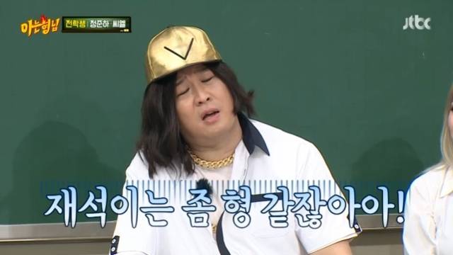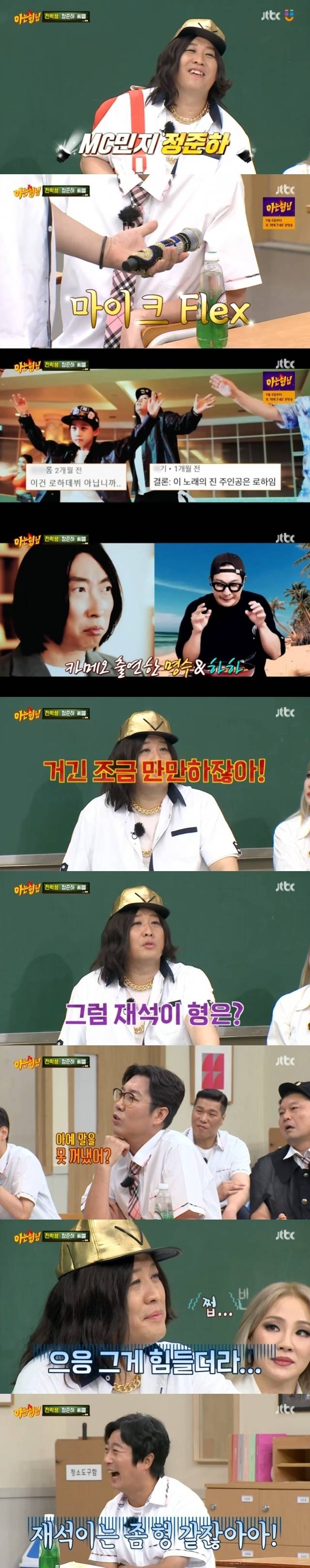 이날 정준하는 등장부터 어마어마한 존재감을 뽐냈다. 서장훈은 부쩍 살이 찐 정준하에게 "뭐 이렇게 좋은 걸 많이 먹어서 살이 찐거냐"고 물었다. 정준하는 이에 "살 좀 쪘다. 왜 불편하냐"고 당차게 반응, 래퍼 스웨그를 보여주며 자신이 '힙합계를 씹어먹고 있는 중이고'에서 전학온 MC민지라고 밝혔다.