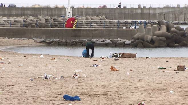 수북이 쌓인 담배꽁초와 술병이 나뒹굴고 해변가에 그대로 잠이 든 취객까지 있습니다.