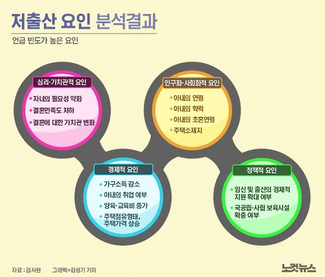 감사원이 한국행정연구원에 의뢰한 연구에 따르면 저출산 요인에는 여러 가지가 있지만, 핵심 요인은 결혼에 대한 가치관이 변화했다는 것이다.