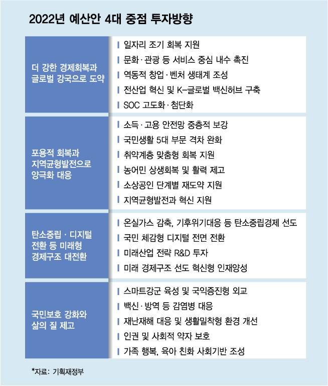 내년 예산안의 세 번째와 네 번째 중점 투자방향은 각각 '탄소중립·디지털 전환 등 미래형 경제구조 대전환'과 '국민보호 강화와 삶의 질 제고'다.
