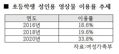 여성가족부가 발표한 '2020 청소년 매체이용 및 유해환경 실태조사' 통계에 따르면 아동 청소년의 성인물 이용률은 급증하고 있다. 최근 1년 간 초등학생의 성인용 영상물 이용률은 33.8%로, 지난 2018년(19.6%)대비 크게 증가한 것으로 나타났다.