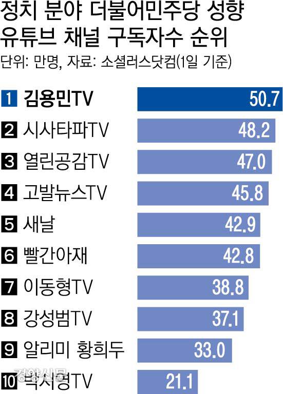 경향신문 취재 결과 더불어민주당을 지지하는 10여개의 대표 채널이 도합 300여만명의 구독자(중복 있음)를 상대로 10월 대선 경선을 앞두고 콘텐츠들을 활발히 생산하고 있는 것으로 나타났다. 대부분 유력 주자인 이재명 경기지사에게 우호적이고, 2위 후보인 이낙연 전 민주당 대표에게는 비판적 논조를 띤다. 2016년 박근혜 당시 대통령 탄핵 촉구 촛불집회와 2019년 조국 전 법무부 장관 사태를 계기로 급성장한 이들은 당원·지지자 여론 형성에서 ‘열쇠’ 역할을 한다. 여당 내 이견을 내는 정치인들에게는 ‘문자 폭탄’을 조장하며 극단적 여론을 생산한다는 비판을 받기도 한다.