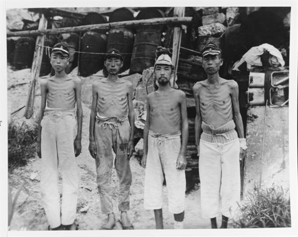 | ▲ 기아 상태에 놓인 일본 해군 장병들(마셜 제도, 1945년 9월 15일) 종전 후 한달이 지난 시점에서도 영양 상태가 회복되지 못한 모습이 눈에 띈다. 밀리 환초를 비롯하여 마셜제도에 배치되었던 병력들은 본국으로부터의 보급이 끊기면서 극단적인 기아 상태에 놓였다. |