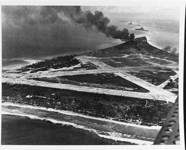 | ▲ 미군의 공습을 받는 밀리 환초의 일본 해군 비행장(1943년 11월) 일본 해군은 태평양 각지의 도서지역들이 '가라앉지 않는 항공모함' 역할을 할 것이라 기대하며 사수를 고집했다. 밀리 환초 역시 이러한 집착에 따라 대규모 수비대가 주둔하게 되었다. |