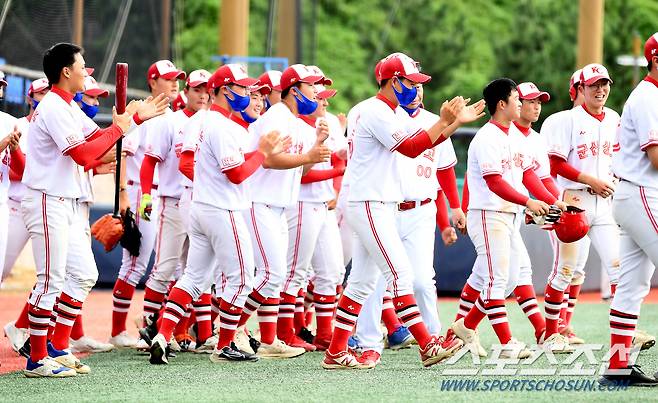 제76회 청룡기 전국고교야구선수권대회 8강전 군산상업고와 대구상원고의 경기가 2일 공주시립야구장에서 열렸다. 9회말 2사 만루 군산상업고 김범서의 밀어내기 볼넷으로 승리한 군산상업고 선수들이 환호하고 있다. 공주=박재만 기자 pjm@sportschosun.com/2021.09.02/