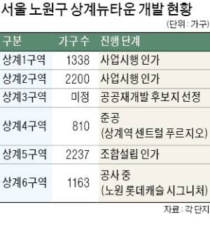 상계뉴타운 내 구역들은 사업 추진 속도 차가 크다. 상계4구역은 지난해 1월 ‘노원센트럴 푸르지오’(810가구)로 변신했다. 상계6구역은 지난해 7월 ‘노원 롯데캐슬시그니처’(1163가구)로 공급됐다. 1338가구를 짓는 상계1구역은 지난해 10월 사업시행 인가를 마쳤다. 이달 시공사 입찰 제안서를 받아 다음달 시공사를 선정할 예정이다. 2009년 조합을 설립한 상계5구역은 사업시행인가를 준비하고 있다. 2014년 정비구역에서 해제된 3구역은 지난 3월 국토교통부의 공공재개발 2차 후보지로 선정되면서 재정비 사업에 다시 불을 지폈다.