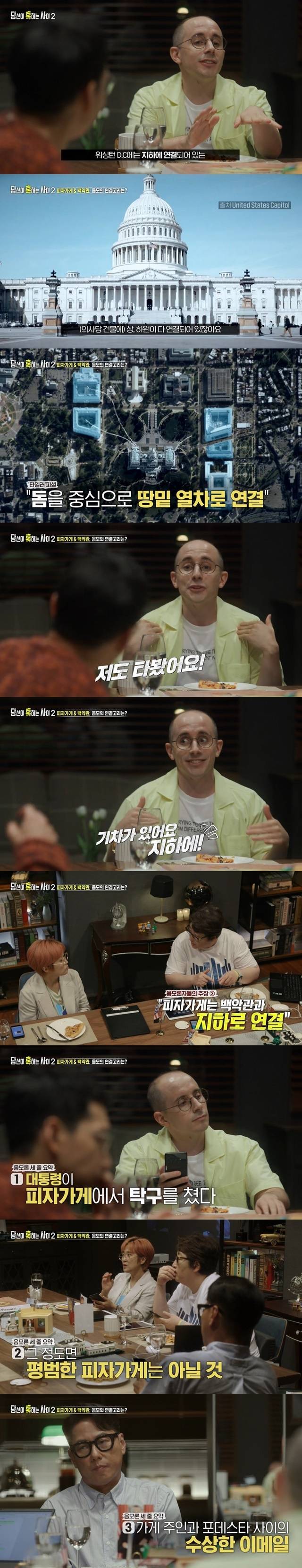 음모론자들의 주장은 피자가게가 백악관과 지하로 연결돼 있다는 것. 이에 타일러는 “워싱턴 D.C는 지하가 연결된 건물이 많다. 의사당 건물에 상, 하원이 다 연결돼 있다. 양쪽 많은 건물들이 땅 밑 기차로 연결돼 있다. 저도 타봤다”고 경험담을 말하기도 했다. (사진=SBS ‘당신이 혹하는 사이 시즌2’ 캡처)