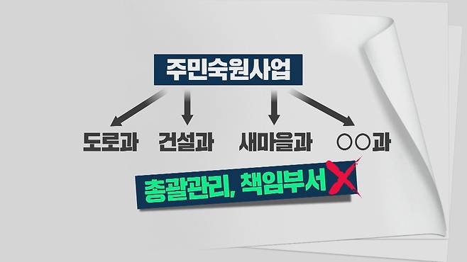 경북의 한 자치단체에선 도로과와 건설과, 새마을과와 각 읍면동 사무소가 모두 주민숙원사업을 제각각 진행하고 있습니다. 주민숙원사업을 총괄 관리하고 책임지는 부서가 없다 보니, 전체 예산 규모가 얼마인지, 얼마나 많은 사업이 어느 정도 규모로 진행되고 있는지 실무 공무원조차도 잘 모릅니다.