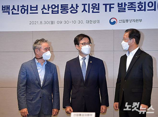 글로벌 백신 허브 구축을 산업통상 측면에서 지원하기 위한 정부 태스크포스(TF)가 첫 회의를 열고 공식 활동을 시작했다. 30일 오전 서울 중구 대한상공회의소에서 열린 글로벌 백신허브 산업통상 지원TF 발족회의에 참석한 이승규 한국바이오협회 부회장(왼쪽부터), 여한구 산업통상자원부 통상교섭본부장, 김상묵 코트라 혁신성장본부장과 회의 시작 전 기념촬영하고 있다. TF는 국내 백신 원부자재 기업의 해외 진출 지원과 글로벌 백신기업의 국내 투자 유치를 통한 글로벌 백신 공급망 강화에 주력하기로 했다. 박종민 기자