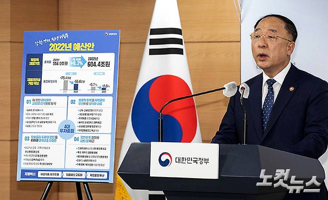 홍남기 경제부총리 겸 기획재정부 장관이 31일 정부서울청사 합동브리핑실에서 2022년 예산안 및 2021-2025년 국가재정운용계획 브리핑을 하고 있다. 정부는 내년도 예산 총지출 규모를 604조 4천억 원으로 확정했다. 올해 558조 원(이하 본예산 기준)보다 46조 4천억 원, 8.3% 늘어난 규모다. 황진환 기자