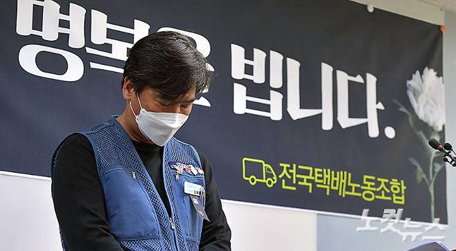 김태원 전국택배노조 수석부위원장이 2일 서울 서대문구 전국서비스산업노동조합연맹에서 김포대리점 소장의 사망에 대한 노동조합 조사결과를 공개하기 전 고인에 대한 묵념을 하고 있다. 택배노조는 지난달 30일 노조를 원망하는 유서를 남기고 숨진 CJ대한통운 대리점주 사건과 관련해 일부 조합원의 괴롭힌 행위가 있음을 확인했다고 밝혔다. 박종민 기자