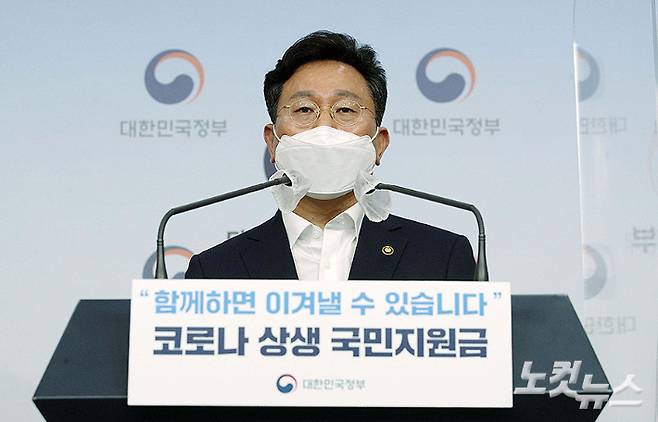 고규창 행정안전부 차관이 30일 서울 종로구 정부서울청사에서 '코로나 상생 국민지원금 세부시행계획'을 발표하고 있다. 정부는 코로나19 장기화로 침체된 경기를 진작하고 영세업자·소상공인을 지원하기 위해 9월 6일부터 10월 29일까지 1인당 25만 원의 재난지원금을 지급한다. 지원금 유형은 신용카드와 체크카드, 지역사랑상품권, 선불카드 중 하나를 선택할 수 있다. 박종민 기자