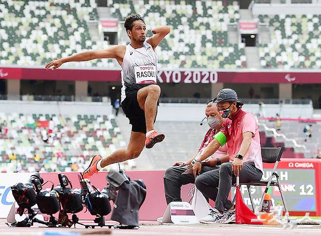31일 일본 도쿄 올림픽스타디움에서 열린 2020 도쿄패럴림픽 남자 멀리뛰기 결선에 출전한 아프가니스탄 호사인 라소울리가 도약하고 있다. 지뢰 폭발로 왼손을 잃은 라소울리는 국제사회의 도움으로 프랑스 파리를 거쳐 대회 나흘 째였던 지난달 28일 태권도 여자 대표 자키아 쿠다다디와 함께 도쿄에 입성했다. 사진공동취재단