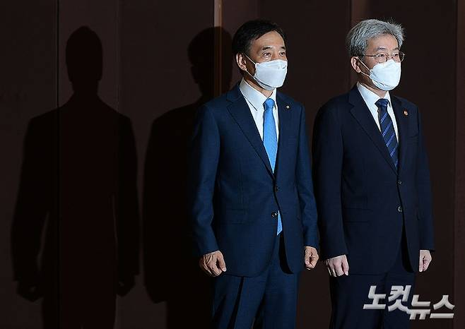 이주열 한국은행 총재(왼쪽)가 3일 오전 서울 중구 한국은행에서 고승범 금융위원장과 회동 전 기념촬영을 하고 있다. 국가 금융 수장과 통화 수장은 1,800조 원을 돌파한 가계부채 문제 해결을 위해 긴밀하게 협조하기로 했다. 이한형 기자
