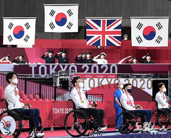 30일 일본 도쿄 메트로폴리탄 체육관에서 열린 2020 도쿄패럴림픽 탁구 남자 단식(스포츠 등급1)에서 금은동을 휩쓴 대한민국 선수들이 시상식에서 3개의 태극기가 게양되는 모습을 바라보고 있다. 왼쪽부터 김현욱(은), 주영대(금), 매튜 토마스(동), 남기원(동). 사진공동취재단