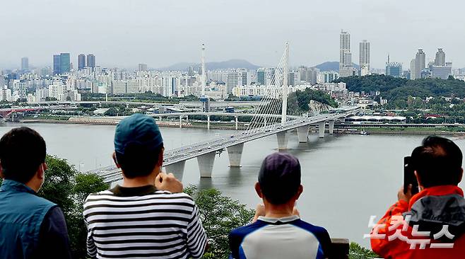 1일 서울 마포구 하늘공원에서 시민들이 차량 운행이 시작된 월드컵대교를 촬영하고 있다. 한강의 31번째 다리인 월드컵대교는 11년 만에 완공돼 이날 개통됐다. 또 성산대교 남단과 서해안고속도로를 지하로 연결하는 서부간선지하도로도 동시에 개통됐다. 박종민 기자