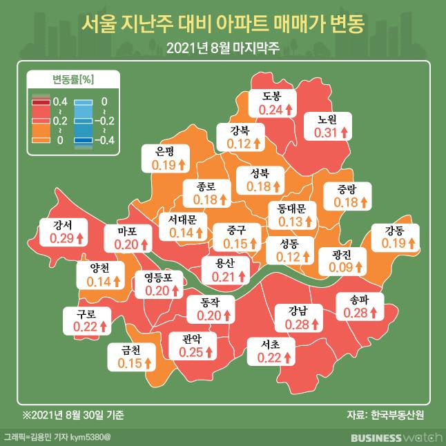 한국부동산원에 따르면 8월 마지막주(30일 기준) 서울 아파트 매매가격은 0.21%로 지난주보다 상승폭은 0.01%포인트 감소했다.